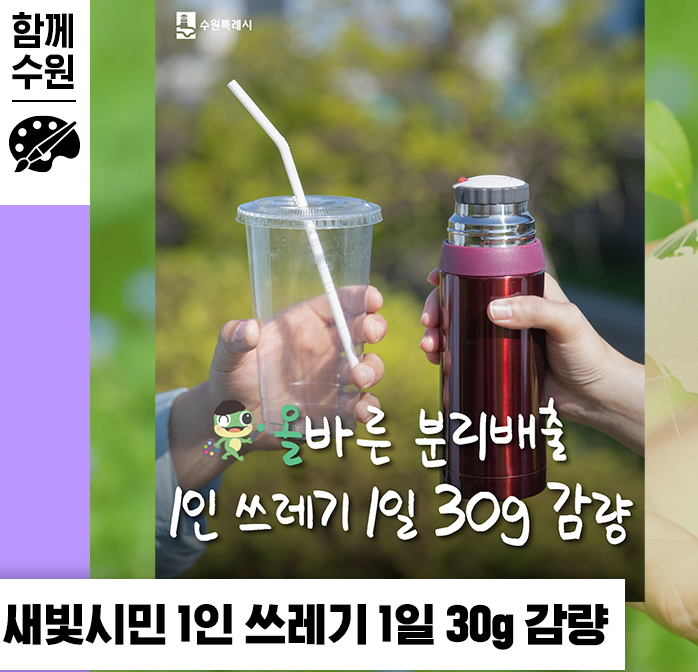 수원시는 2025년 탄소중립 도시를 향해 ‘새빛시민 1인 1일 30g 쓰레기 감량 실천 캠페인’을 펼치고 있습니다.